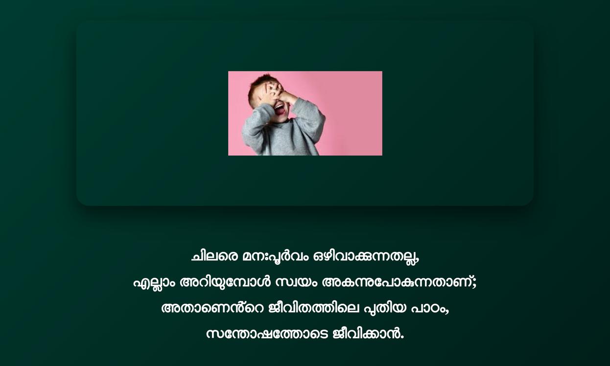 Avoiding Quotes Malayalam | ഒഴിവാക്കൽ മലയാളം ഉദ്ധരണികൾ: ജീവിതത്തിൽ നാം നേരിടുന്ന വെല്ലുവിളികളോടുള്ള പ്രതികരണത്തിലാണ് യഥാർത്ഥ success ഇരിക്കുന്നത്. ചിലപ്പോൾ, ഒഴിവാക്കുക എന്നത് ഒരു wise choice ആണ്. ഇത് mental peace നിലനിർത്താനും, ഊർജ്ജം പോസിറ്റീവ് ആയി ഉപയോഗിക്കാനും സഹായിക്കും. ആരോഗ്യകരമായ ഒഴിവാക്കലുകൾ ബന്ധങ്ങളിൽ വ്യക്തത നൽകുന്നു. ഇത് വെറും പിന്മാറ്റമല്ല, സ്വയം കരുത്തുനേടാനുള്ള ബുദ്ധിപരമായ മുന്നേറ്റമാണ്. ഇത്തരം ഉദ്ധരണികൾ നിർണായക തീരുമാനങ്ങളെടുക്കാൻ നിങ്ങളെ പ്രോത്സാഹിപ്പിക്കും.