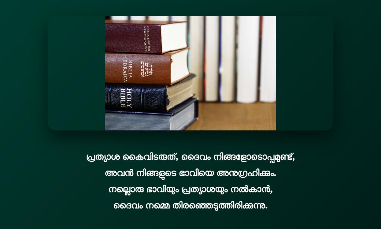 Bible Quotes in Malayalam | ബൈബിൾ ഉദ്ധരണികൾ മലയാളത്തിൽ: ജീവിതത്തിലെ ഏത് പ്രതിസന്ധിയിലും ആശ്വാസവും മാർഗ്ഗനിർദ്ദേശവും നൽകാൻ ഈ ദിവ്യവചനങ്ങൾക്കാകും. പ്രത്യാശയുടെയും സമാധാനത്തിന്റെയും വെളിച്ചം പരത്തിക്കൊണ്ട്, നമ്മുടെ journey-യിൽ എന്നും ഒരു വഴികാട്ടിയായി ബൈബിൾ ഉദ്ധരണികൾ നിലകൊള്ളുന്നു. സ്നേഹം, ക്ഷമ, വിശ്വാസം എന്നിവയുടെ പ്രാധാന്യം ഓർമ്മിപ്പിച്ചുകൊണ്ട്, ഓരോ വചനവും നമ്മെ ഒരു മികച്ച വ്യക്തിയാകാൻ പ്രേരിപ്പിക്കുന്നു.
