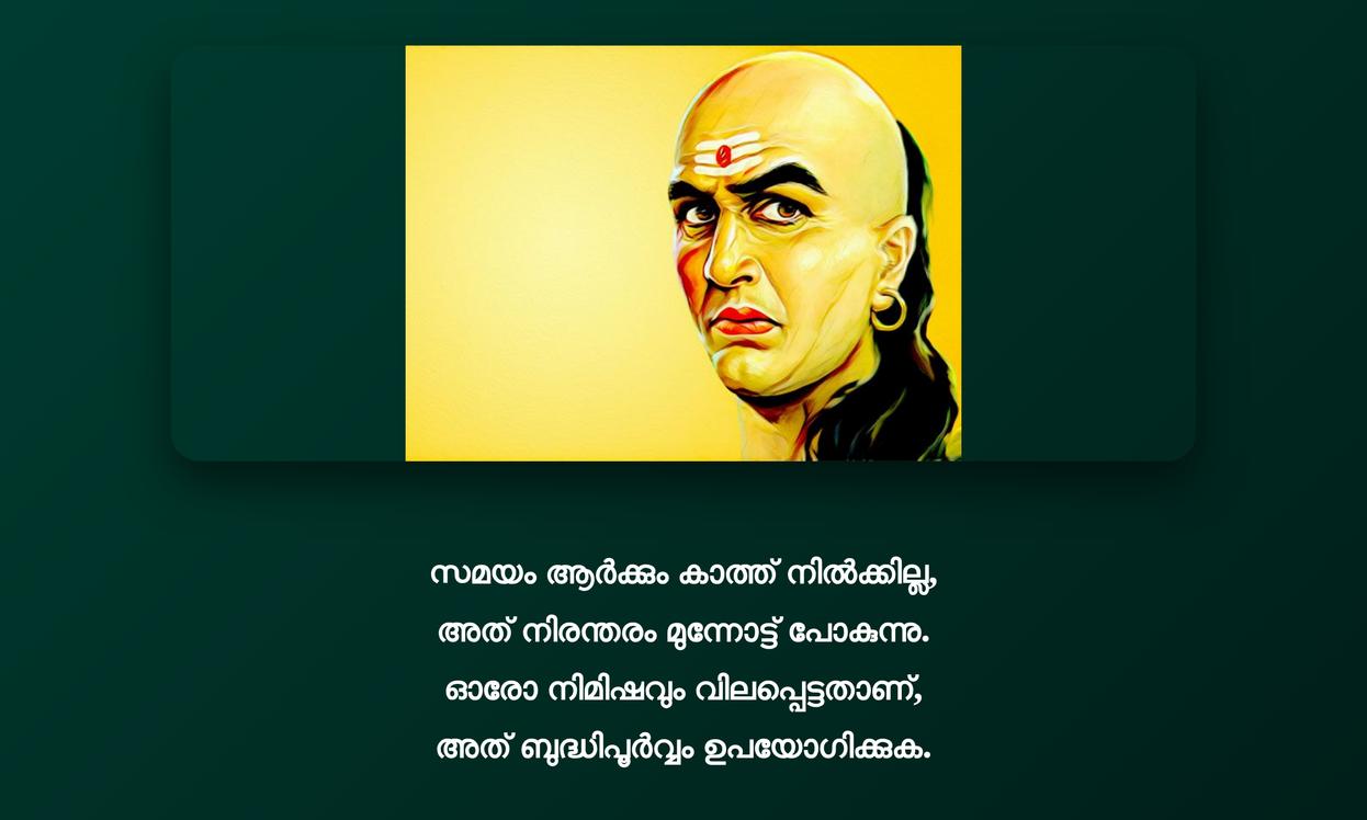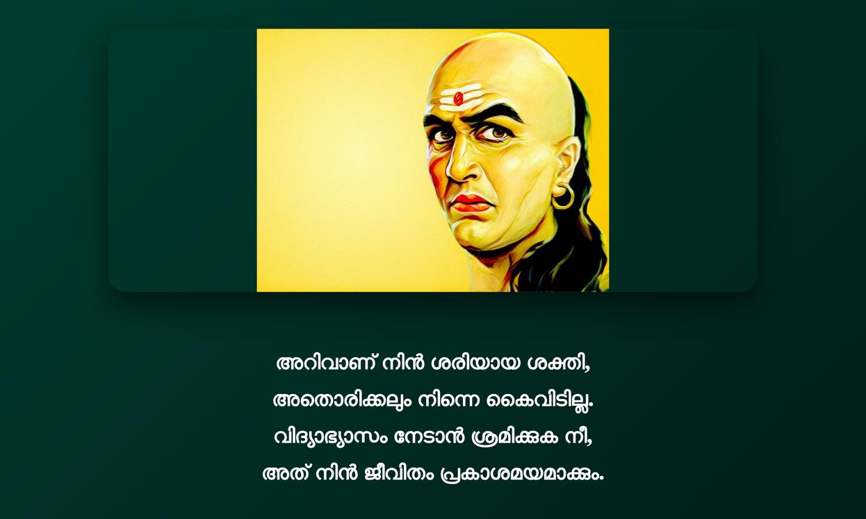 Chanakya Malayalam Quotes | ചാണക്യൻ മലയാളം ഉദ്ധരണികൾ: ചാണക്യൻ്റെ ഉദ്ധരണികൾ കേവലം പഴഞ്ചൊല്ലുകളല്ല, മറിച്ച് കാലാതീതമായ wisdom നിറഞ്ഞ ജീവിത പാഠങ്ങളാണ്. വ്യക്തിഗത വളർച്ചയ്ക്കും സമൂഹത്തിൻ്റെ ഉന്നമനത്തിനും ഇത് മാർഗ്ഗനിർദ്ദേശങ്ങൾ നൽകുന്നു. വിജയകരമായ ജീവിതം കെട്ടിപ്പടുക്കാനും വെല്ലുവിളികളെ നേരിടാനും അദ്ദേഹത്തിൻ്റെ തത്വങ്ങൾ നമ്മെ സഹായിക്കുന്നു.