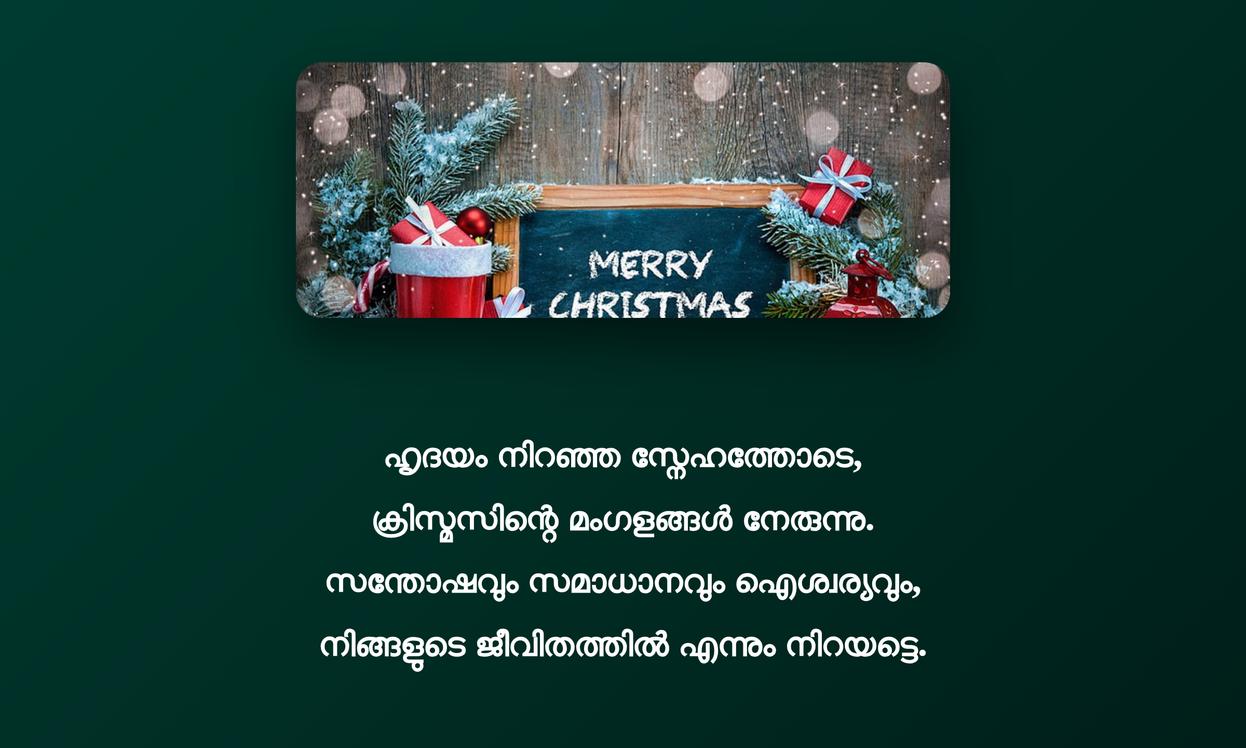 ഓരോ വാക്കും സ്നേഹത്തിന്റെ പ്രകാശമാകട്ടെ. ഈ ക്രിസ്മസ് നിങ്ങളുടെ ജീവിതത്തിൽ സമാധാനവും സന്തോഷവും നിറയ്ക്കട്ടെ, പുതിയ പ്രതീക്ഷകളിലേക്ക് വഴിതെളിയിക്കട്ടെ. എല്ലാവർക്കും ഹൃദയം നിറഞ്ഞ ക്രിസ്മസ് ആശംസകൾ! Let’s spread joy and happiness, making this season truly special.