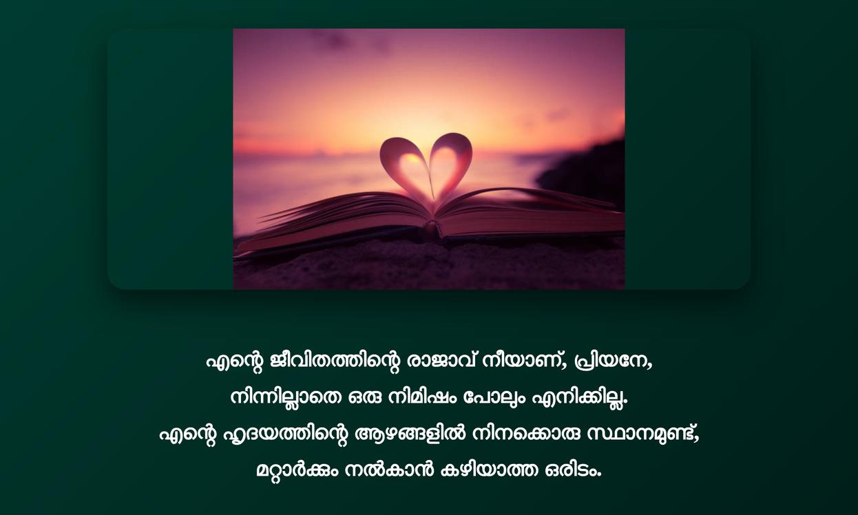 നിങ്ങളുടെ പ്രിയപ്പെട്ടവരുമായി പങ്കുവെക്കാനുള്ള deepest feelings-നെ മനോഹരമായി അവതരിപ്പിക്കാൻ ഈ ഉദ്ധരണികൾ സഹായിക്കും. പ്രണയത്തിന്റെ മാന്ത്രികതയും, commitment-ഉം, പരസ്പരമുള്ള വിശ്വാസവും ഈ വാക്കുകളിൽ നിറഞ്ഞുനിൽക്കുന്നു. ഈ quotes നിങ്ങളുടെ relationship-നെ ദൃഢമാക്കാനും, സ്നേഹത്തിന്റെ പുതിയൊരു dimension കണ്ടെത്താനും സഹായിക്കും. ജീവിതത്തിലെ challenges-നെ അതിജീവിക്കാൻ ഇത് പ്രചോദനമാവട്ടെ. സ്നേഹബന്ധങ്ങളെ കൂടുതൽ അഗാധമാക്കാൻ ഇത് ഒരു emotional bridge ആയി പ്രവർത്തിക്കും.