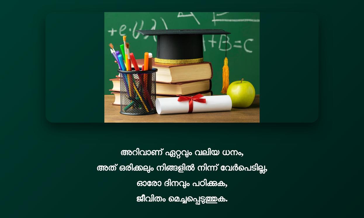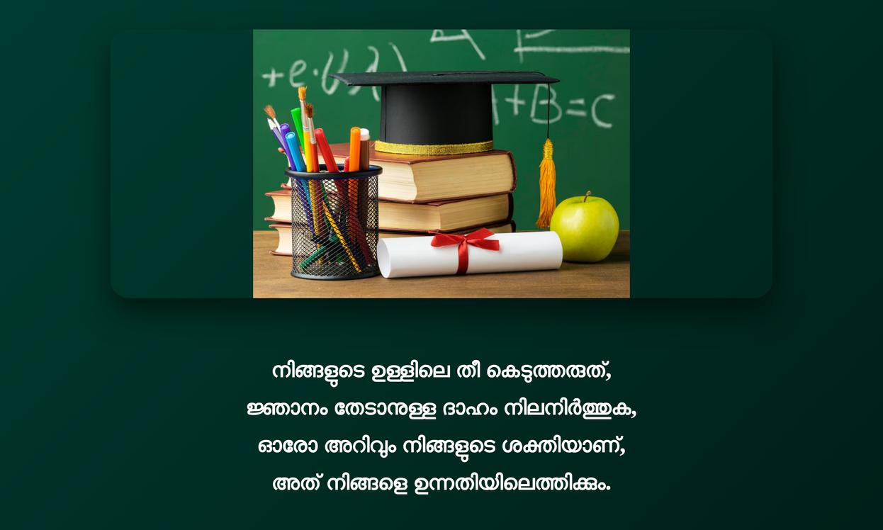 അതുകൊണ്ട്, ഓരോ ഉദ്ധരണിയും ഒരു ഉൾക്കാഴ്ചയായി കണ്ട്, നമ്മുടെ പഠനയാത്രയിൽ (learning journey) കൂടുതൽ ശ്രദ്ധയോടെ മുന്നോട്ട് പോകാൻ ഈ വാക്കുകൾ നമ്മളെ പ്രേരിപ്പിക്കട്ടെ. വിദ്യാഭ്യാസം ഒരു നിക്ഷേപമാണ്, അതിന്റെ ഫലം ജീവിതകാലം മുഴുവൻ നമ്മളെ പിന്തുടരും. ഈ വാക്കുകൾ എപ്പോഴും നമ്മുടെ ഉള്ളിൽ ഒരു നല്ല ചിന്താഗതിയും പ്രചോദനവും നിലനിർത്താൻ സഹായിക്കുമെന്ന് ഉറപ്പാണ്.