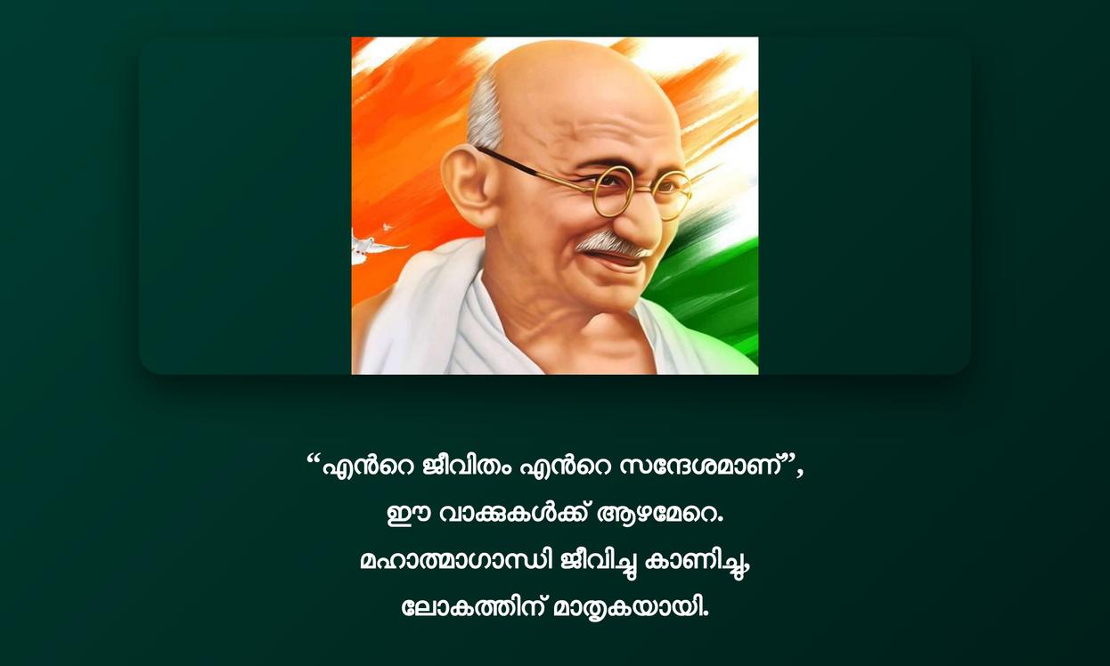 Gandhi Malayalam Quotes | ഗാന്ധി മലയാളം ഉദ്ധരണികൾ: ഗാന്ധിജിയുടെ വാക്കുകൾ വെറും ഉദ്ധരണികളല്ല, അവ ജീവിത പാതയിൽ പ്രകാശമായി നിലകൊള്ളുന്ന philosophy ആണ്. വെല്ലുവിളികളെ നേരിടാനും, empathyയോടെ സമൂഹത്തെ കാണാനും, ആന്തരിക സമാധാനം കണ്ടെത്താനും ഈ വാക്കുകൾ നമ്മളെ സഹായിക്കുന്നു. അദ്ദേഹത്തിന്റെ ദർശനങ്ങൾ timeless ആണ്, ഓരോ തലമുറയ്ക്കും പ്രചോദനം നൽകുന്നു.