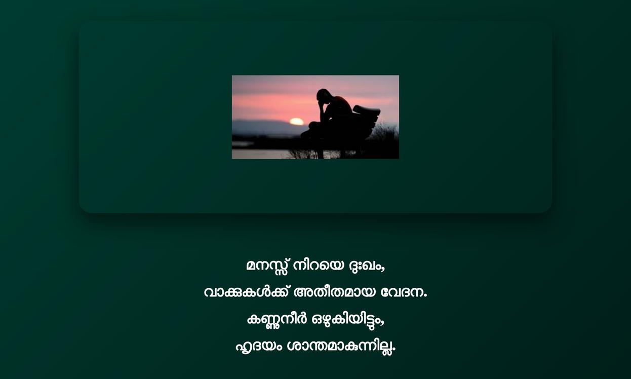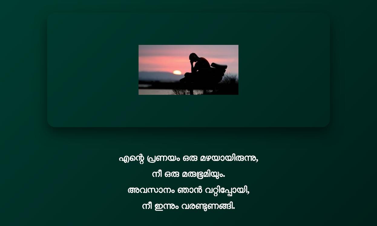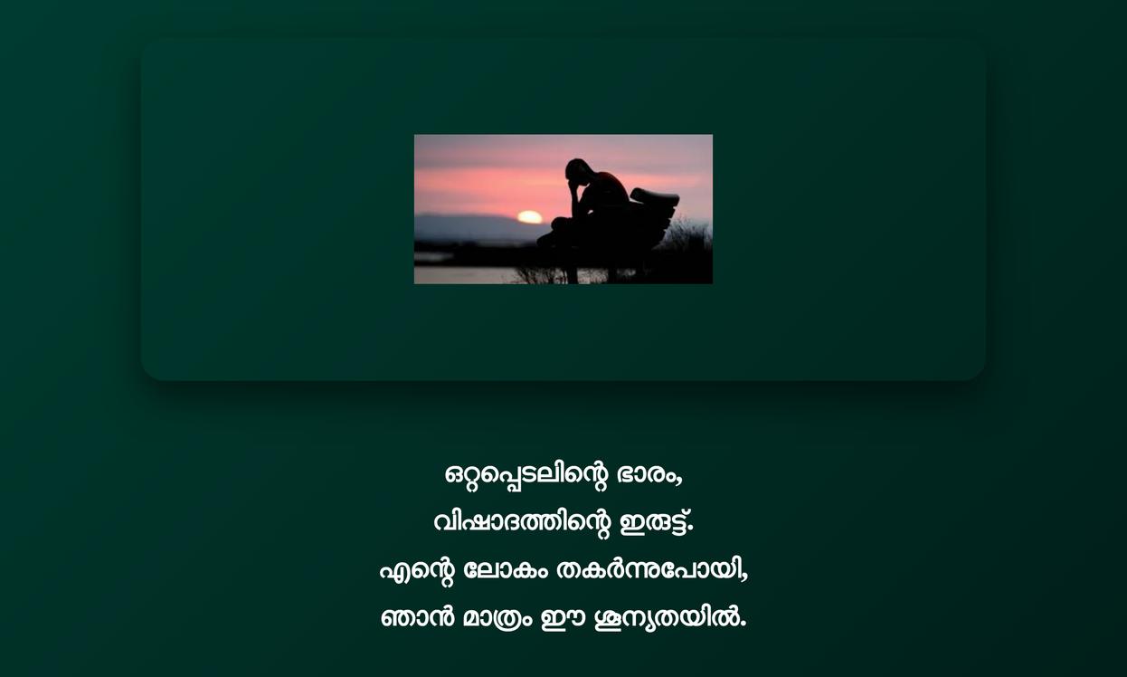Sad Malayalam Quotes | ദുഃഖകരമായ മലയാളം ഉദ്ധരണികൾ: ജീവിതത്തിലെ ഇരുണ്ട നിമിഷങ്ങളിൽ, ഈ ദുഃഖകരമായ മലയാളം ഉദ്ധരണികൾ വെറുമൊരു വായനക്കപ്പുറം ഒരു emotional anchor ആയി വർത്തിക്കുന്നു. അവ നമ്മുടെ ഉള്ളിലെ വേദനകളെ തിരിച്ചറിയാനും, മറ്റുള്ളവരും സമാനമായ experiences-ലൂടെ കടന്നുപോകുന്നുണ്ട് എന്ന് മനസ്സിലാക്കാനും സഹായിക്കും. ദുഃഖം ഒരു മോശം കാര്യമല്ല, മറിച്ച് അത് ജീവിതത്തിന്റെ ഭാഗമാണെന്നും, നമ്മളെ കൂടുതൽ കരുത്തരാക്കുന്ന ഒരു learning process ആണെന്നും ഈ വാക്കുകൾ ഓർമ്മിപ്പിക്കുന്നു.